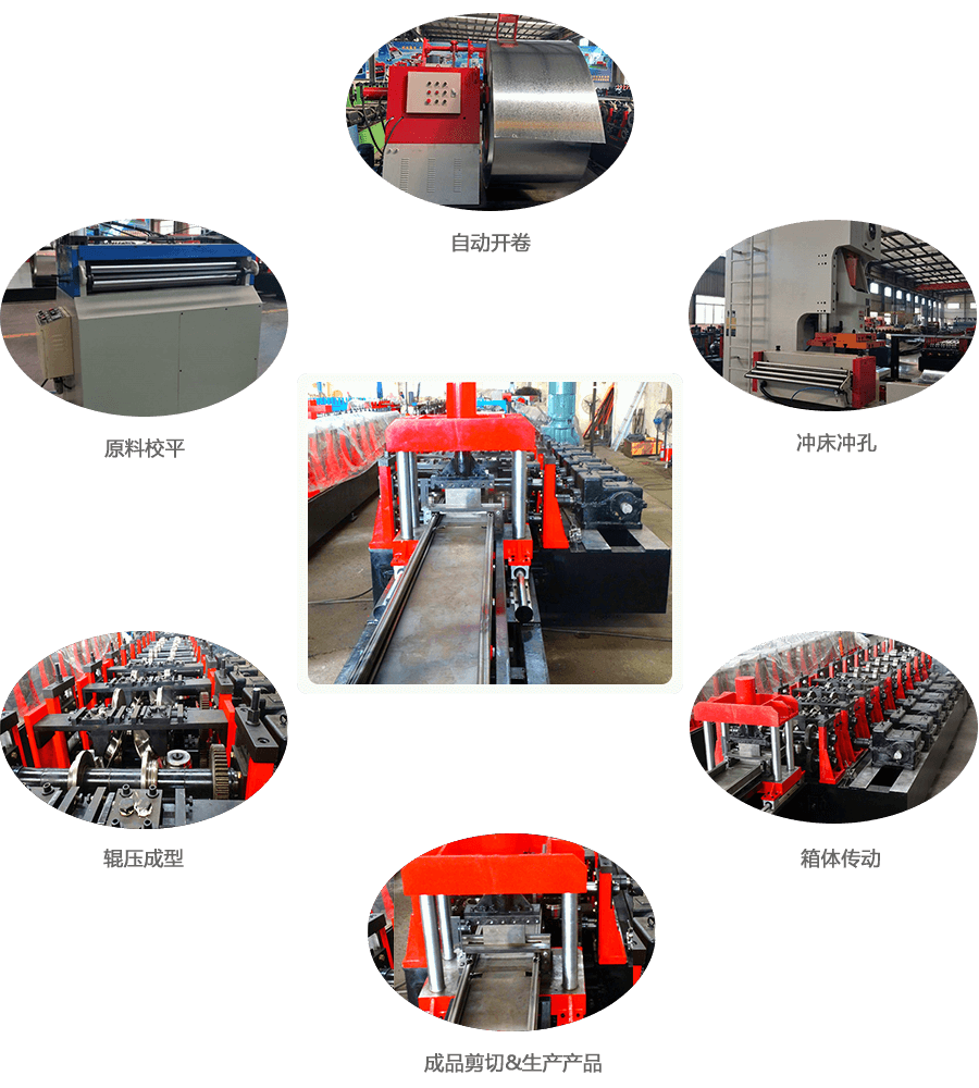工藝流程: 開(kāi)卷→引料校平→儲(chǔ)料→伺服送料→沖翻邊孔→儲(chǔ)料→導(dǎo)向引料→輥壓成型→仿形切斷→托板出料