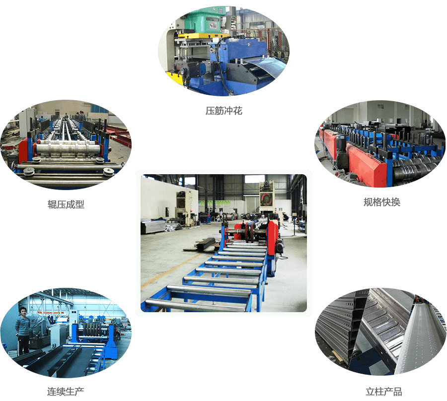工藝流程: 普通槽式橋架:開(kāi)卷→引料、整平→平板沖孔→平板切斷→輥壓成型→成品引料→托板出料 壓筋壓花橋架:開(kāi)卷→引料、整平→儲(chǔ)料→伺服引料→平板沖筋&沖花→儲(chǔ)料→導(dǎo)向引料→平板切斷→輥壓成型→成品引料→托板出料