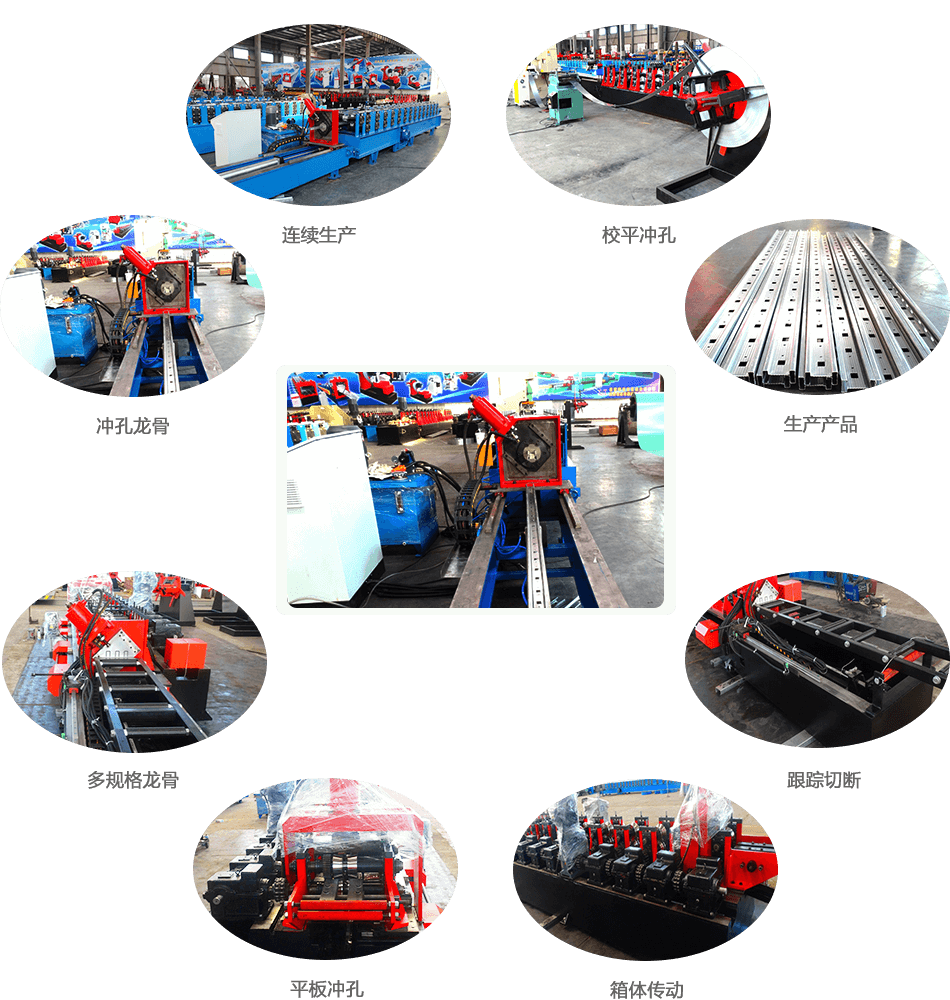 開卷→引料校平→儲料→伺服送料→平板沖孔→儲料→輥壓成型→仿形切斷→出料 開卷→引料校平→平板沖孔→輥壓成型→跟蹤切斷→出料