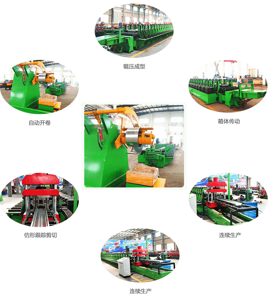 液壓自動(dòng)開卷→引料裝置→校平→輥壓成型→機(jī)械跟蹤沖孔切斷→托料出板